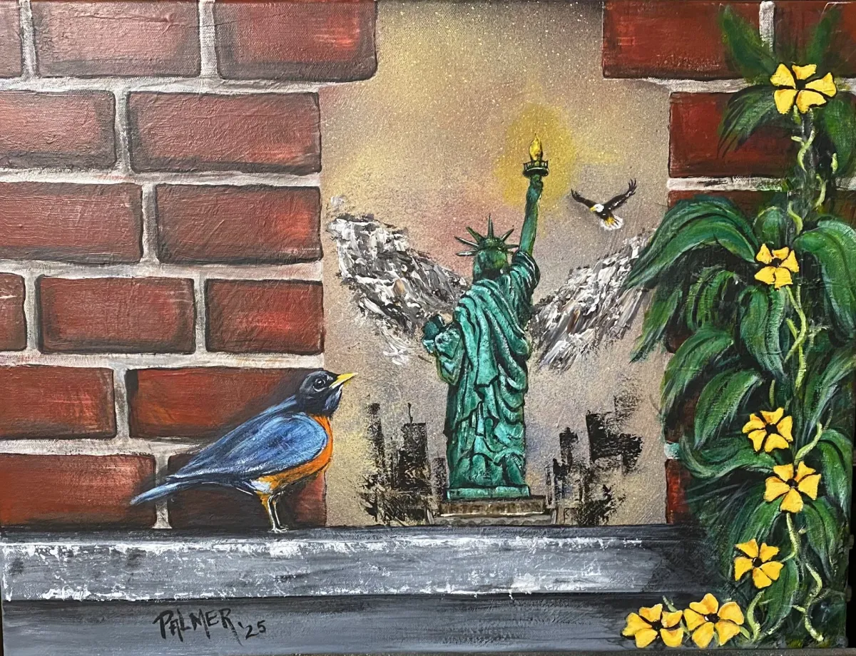 Statue of LibertyAmerican RobinBald Eaglebrick wallvinesyellow flowerspatriotismRealismStorytelling / NarrativeInspirational / UpliftingPatriotic / Military / FreedomAnimals / WildlifeSpiritual / SymbolicHistorical / CulturalInspirational / Uplifting