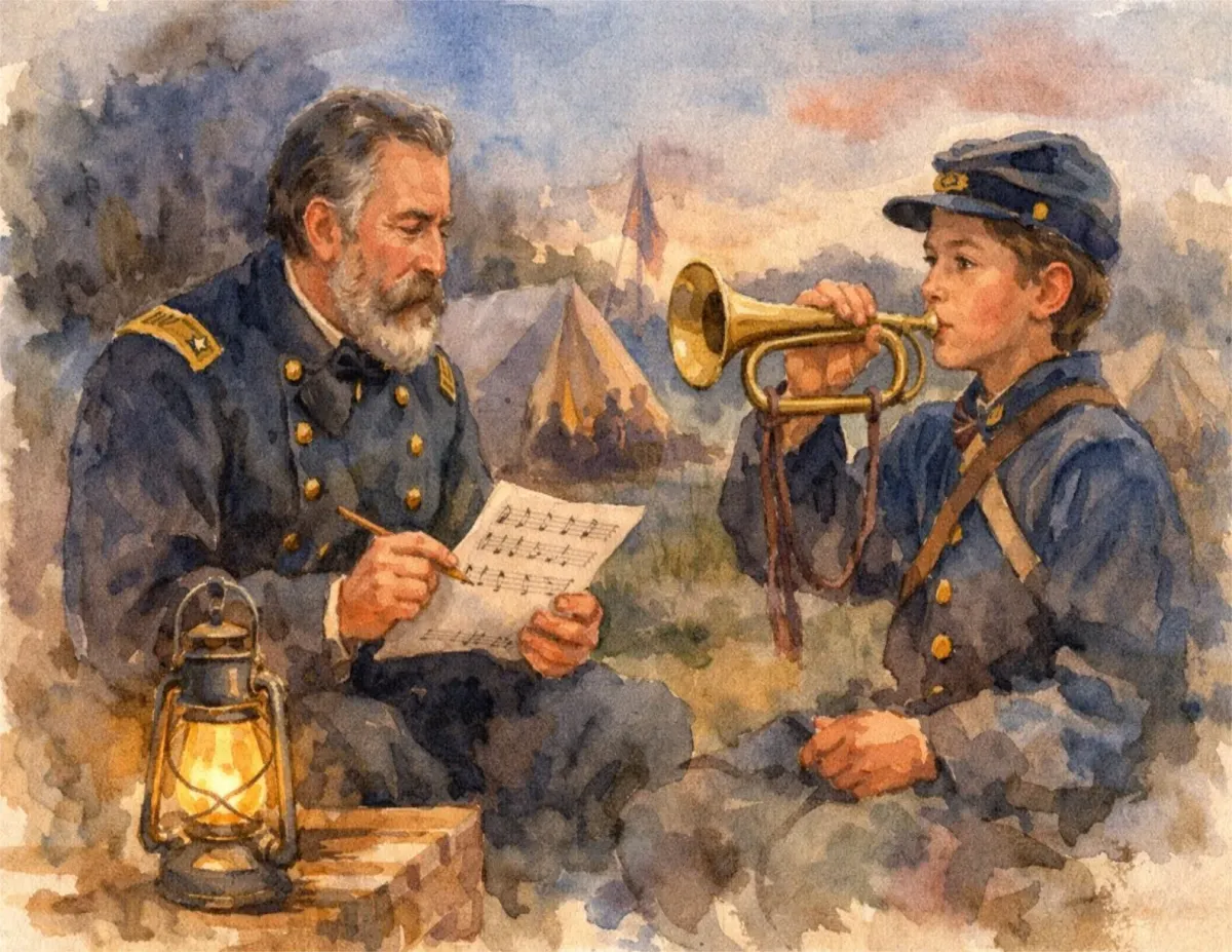 Civil WarmilitarybuglemusiccamphistoricalwatercolorRealismStorytelling / NarrativeLight / SerenePatriotic / Military / FreedomVeteran Story / ServicePortrait / PeopleHistorical / Cultural