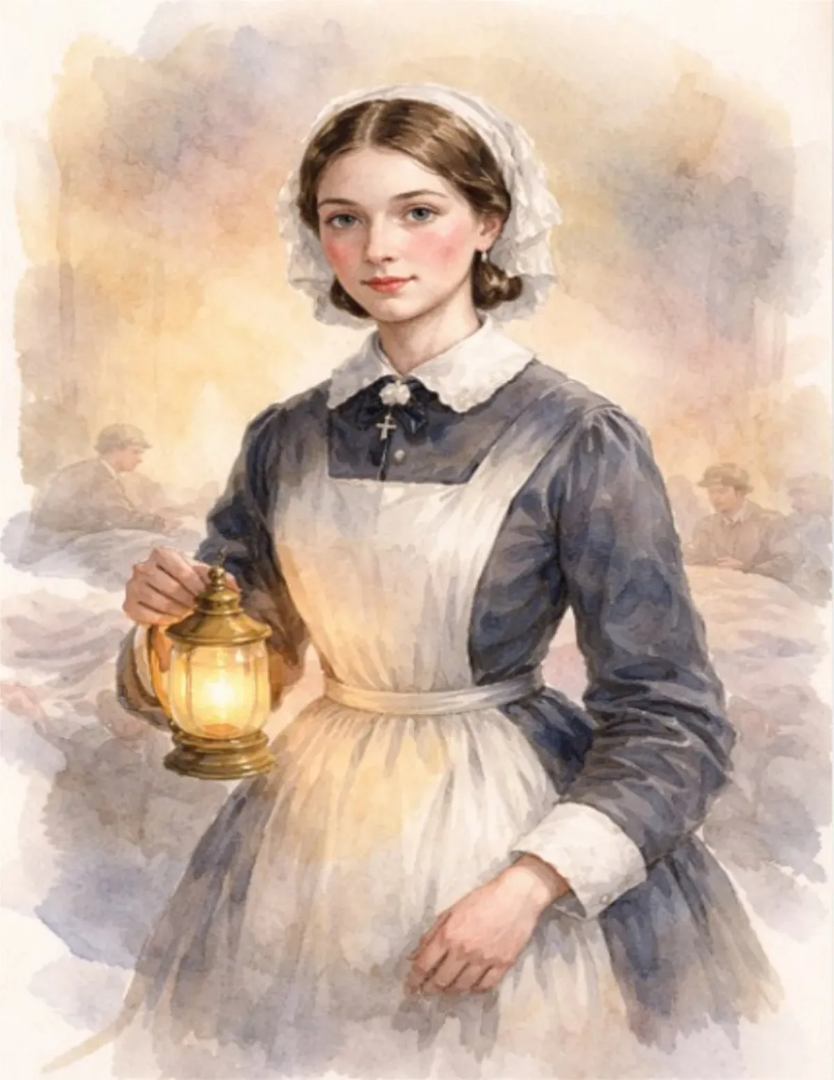 NurseHistoricalWatercolorPortraitLanternHealthcareVictorianRealismStorytelling / NarrativeInspirational / UpliftingLight / SerenePortrait / PeopleHistorical / CulturalHope / Healing / ResilienceSpiritual / Symbolic