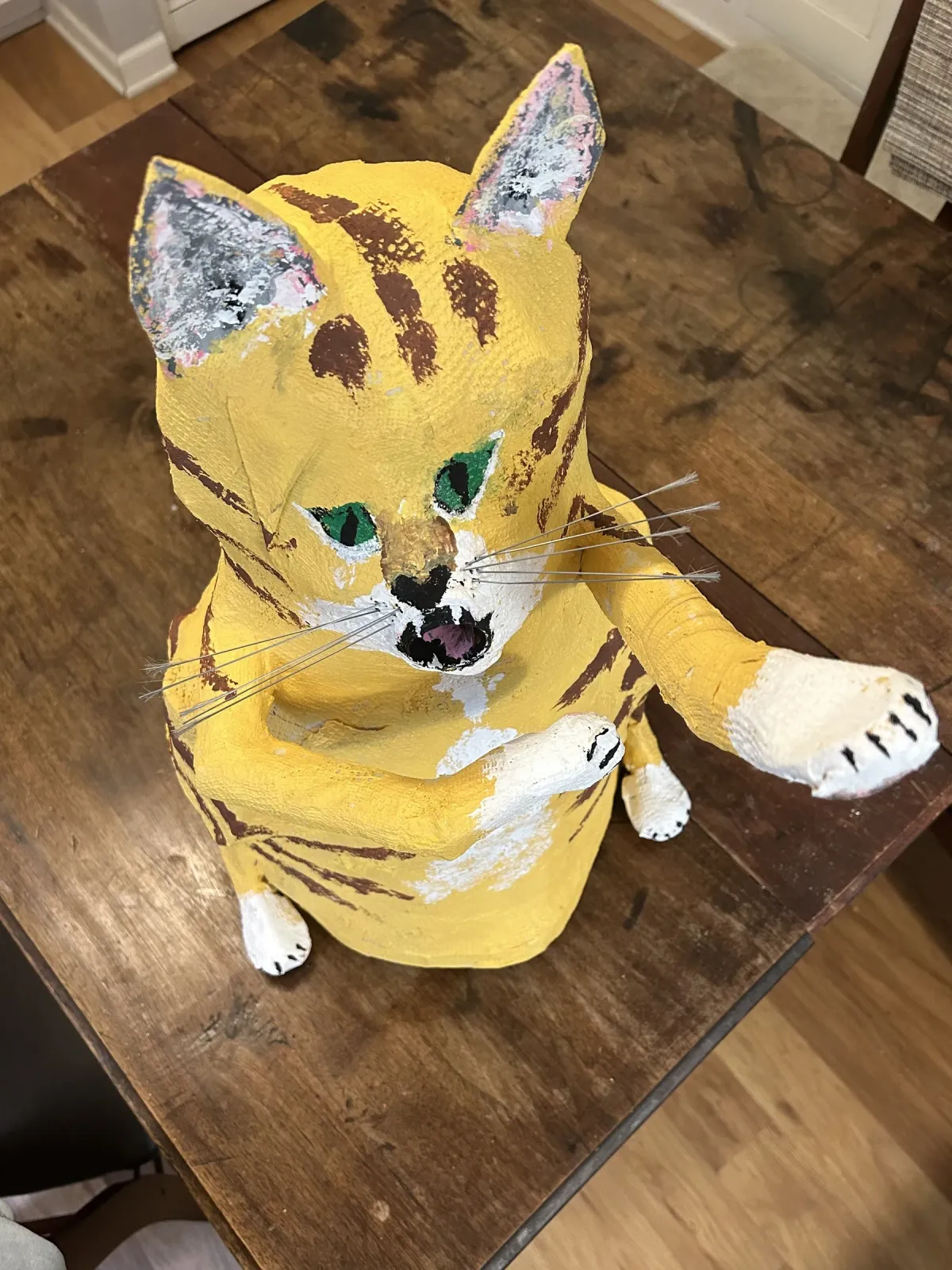 cat sculpturepapier-mâchéyellow catstriped catanimal arthandmadeexpressiveExpressionism / EmotionalStorytelling / NarrativeBold / GraphicAnimals / WildlifeStill Life / ObjectsHumor / Whimsy