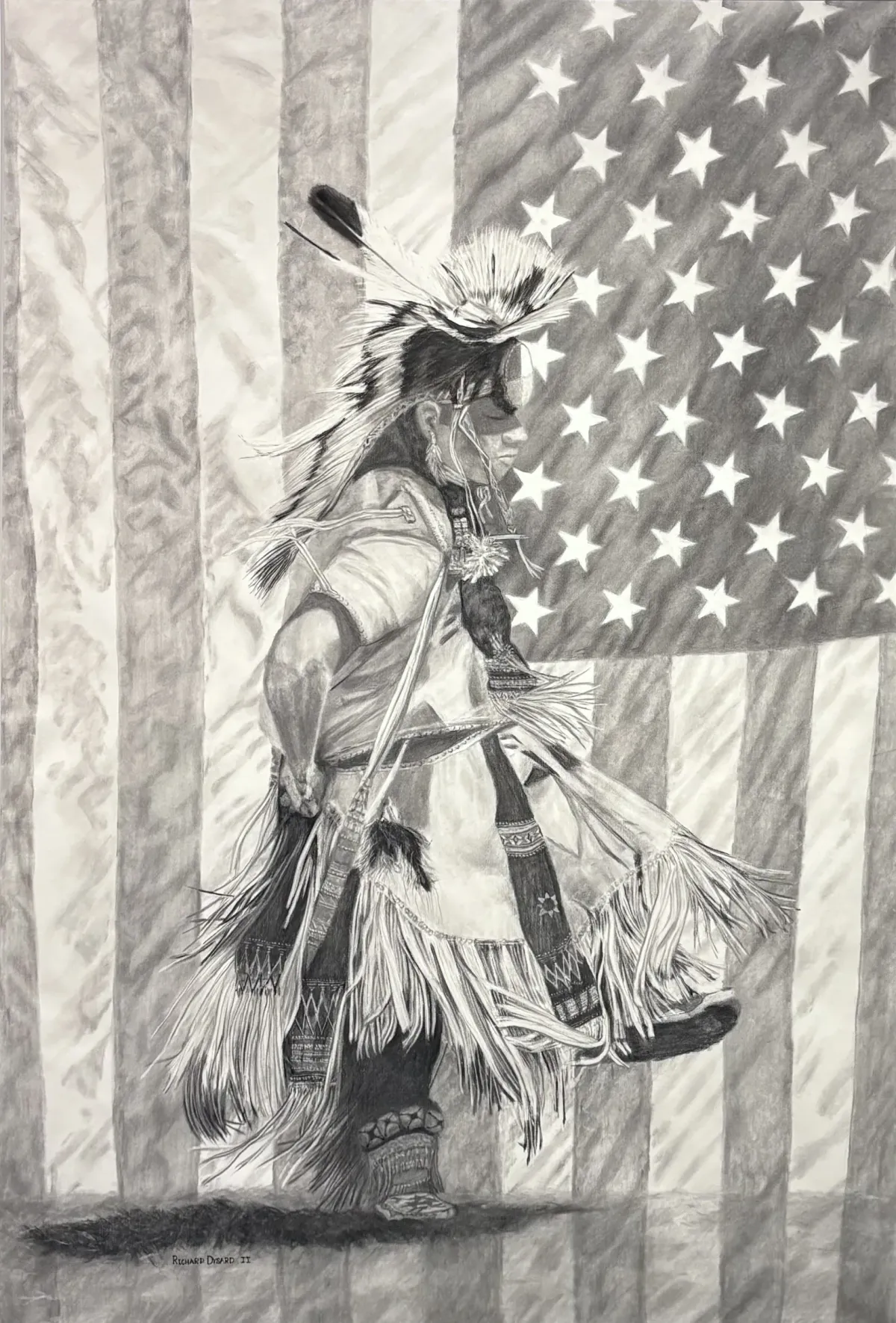 Native Americandancertraditional regaliaAmerican flagpencil drawingcultural heritagepatriotismRealismStorytelling / NarrativeContemporary / ModernPatriotic / Military / FreedomPortrait / PeopleHistorical / Cultural
