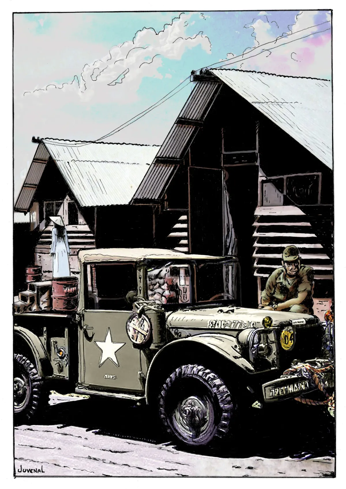 military trucksoldierconical hatcorrugated metalbarracksVietnam War eracomic artRealismStorytelling / NarrativeBold / GraphicDark / DramaticPatriotic / Military / FreedomPortrait / PeopleHistorical / CulturalConflict / Sacrifice