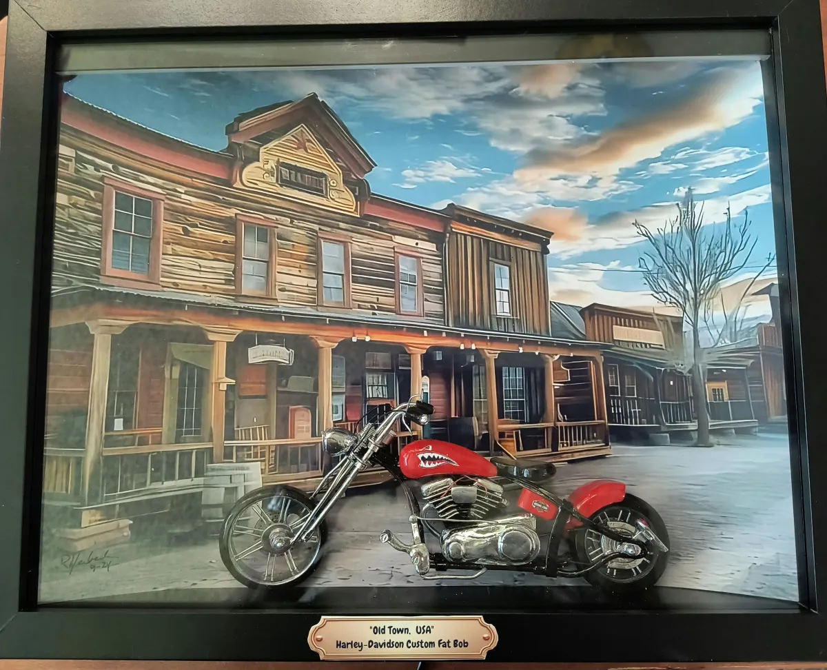 Harley-DavidsonmotorcycleWestern towndiorama3D artstreet sceneAmericanaRealismStorytelling / NarrativeHistorical / CulturalStill Life / ObjectsCity / Architecture