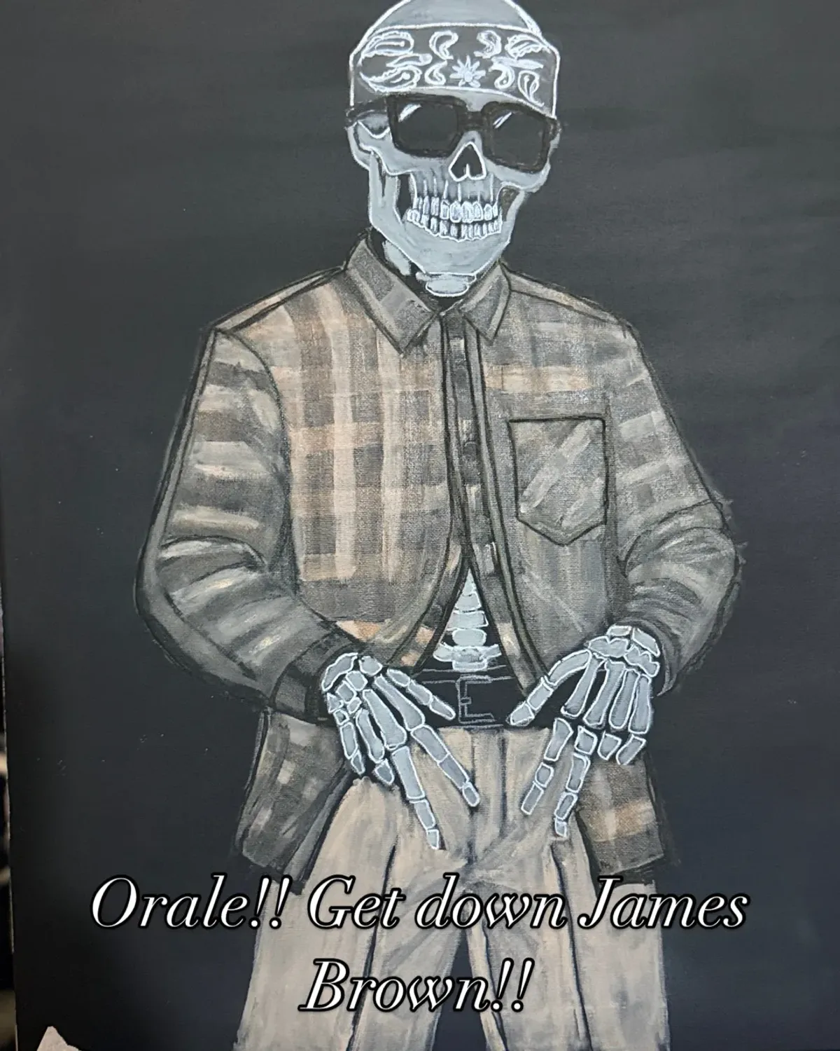 skeletonplaid shirtbandanasunglassesurban stylehand gesturesstreet artBold / GraphicStorytelling / NarrativeContemporary / ModernSpiritual / SymbolicHistorical / Cultural