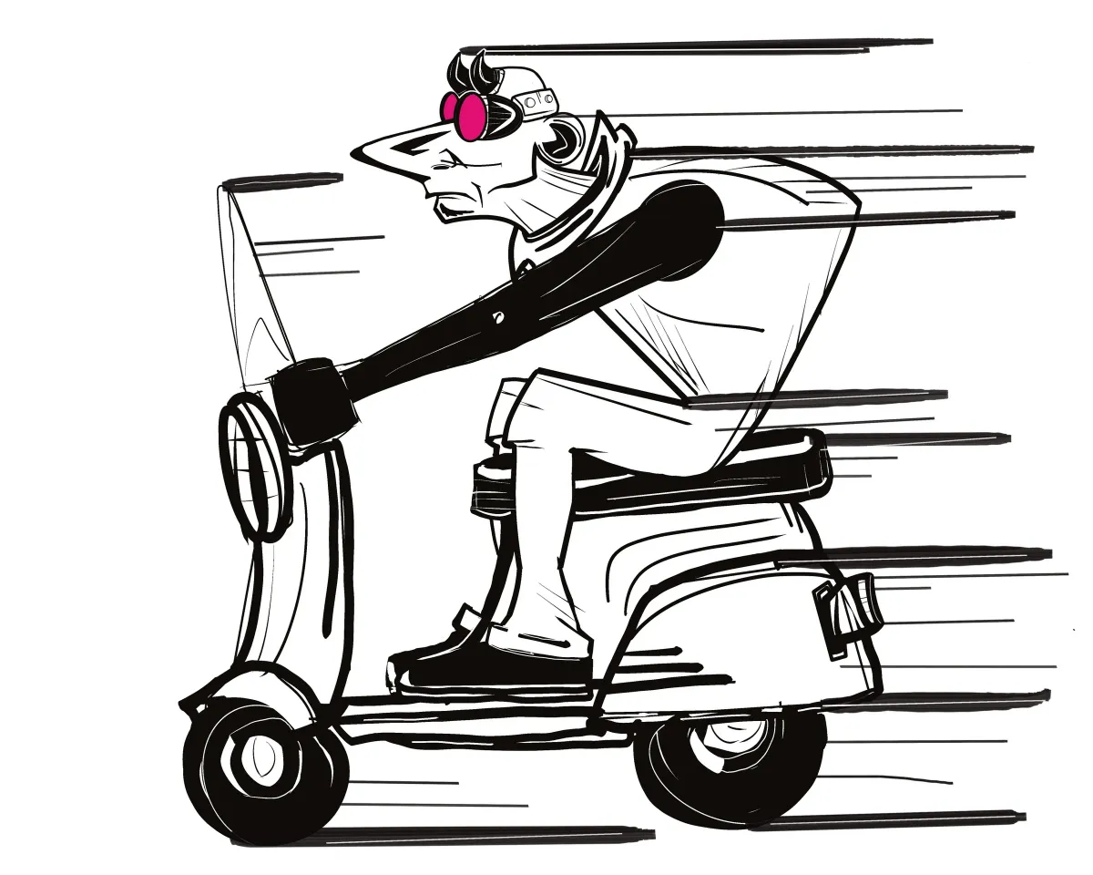 scootercartoonspeedillustrationmonochromegogglesstylizedmotionBold / GraphicContemporary / ModernStorytelling / NarrativeExpressionism / EmotionalPortrait / PeopleHumor / Whimsy