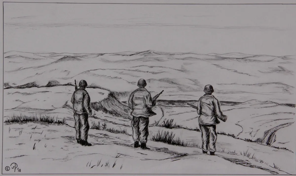 soldiersmilitarylandscapemonochromepen and inkhillsrifleswar artRealismStorytelling / NarrativeDark / DramaticPatriotic / Military / FreedomConflict / SacrificeHistorical / CulturalLandscape / Nature