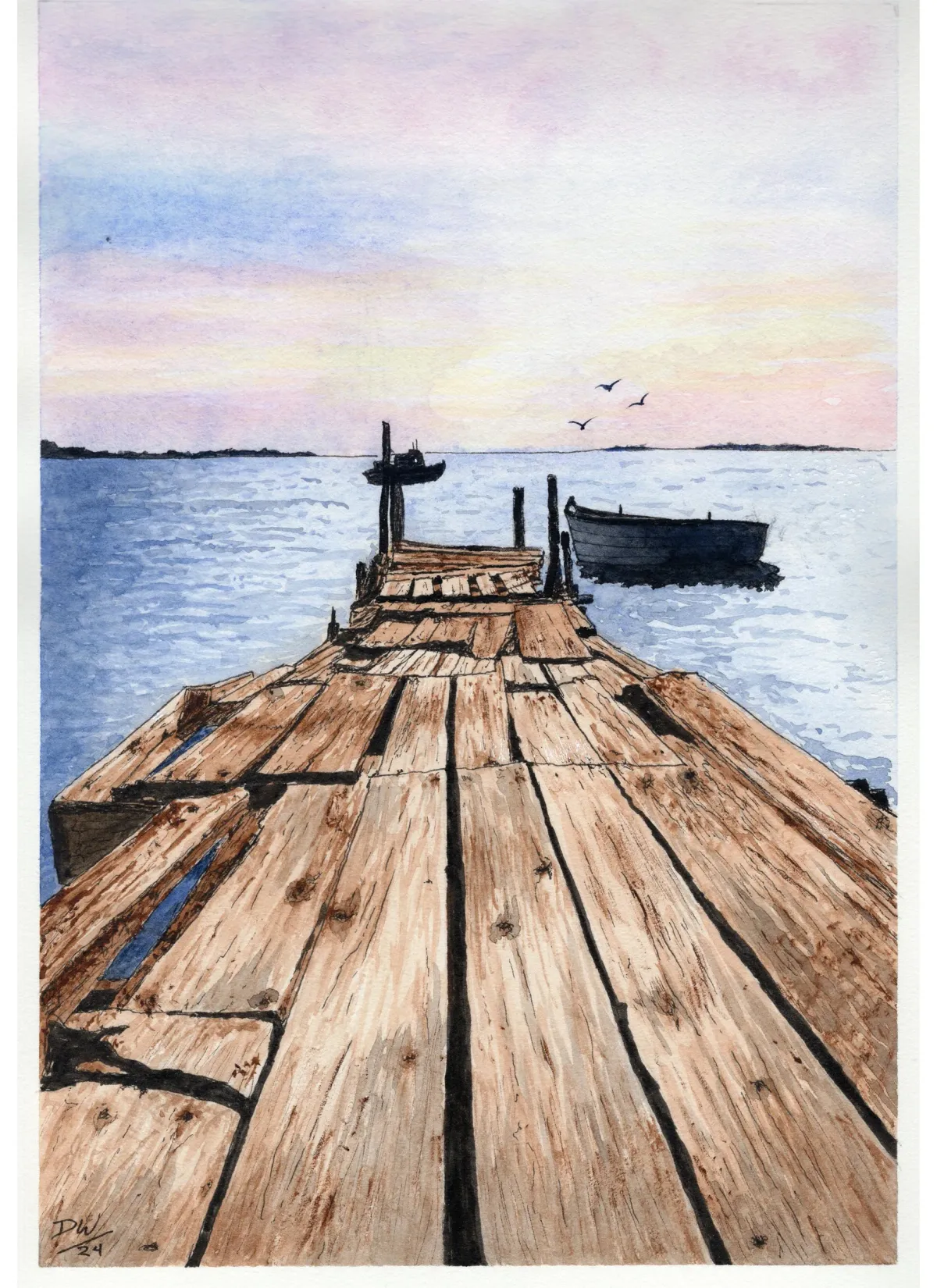 watercolorpierboatseascapesunsettranquilwoodenRealismLight / SereneStorytelling / NarrativeLandscape / NatureSeascape / Water