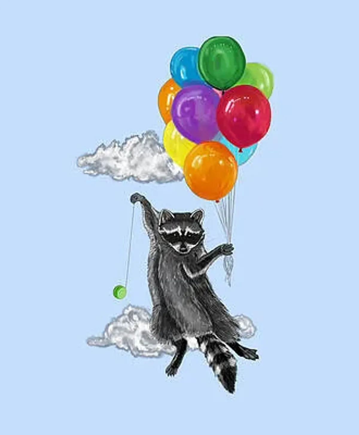 RaccoonBalloonsFlyingYoyoCloudsWhimsicalIllustrationContemporary / ModernLight / SereneStorytelling / NarrativeInspirational / UpliftingAnimals / WildlifeSurreal / ImaginativeHumor / Whimsy