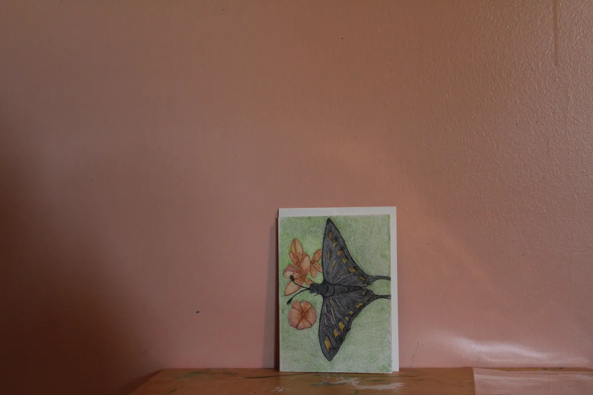 greeting cardbutterfly artflower drawingcolored pencilhandcraftednature illustrationartworkRealismLight / SereneStorytelling / NarrativeLandscape / NatureAnimals / WildlifeStill Life / Objects