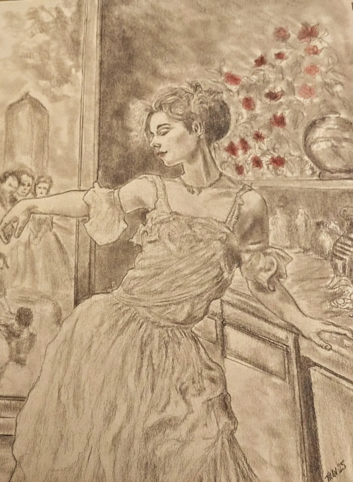 womanelegant dresscharcoal drawingred flowersreflectionvintage styleportraitRealismStorytelling / NarrativeLight / SerenePortrait / PeopleHistorical / Cultural