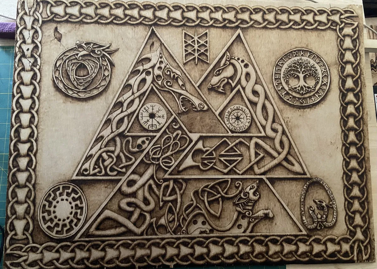 PyrographyNorse mythologyCeltic knotworkRunic symbolsMythical creaturesWood artSymbolic patternsRealismBold / GraphicDark / DramaticStorytelling / NarrativeSpiritual / SymbolicHistorical / CulturalAnimals / Wildlife