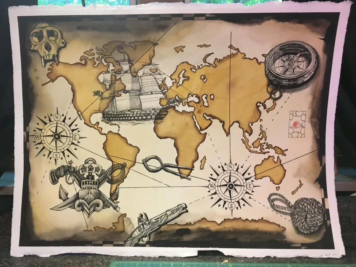 World mapNauticalPirateVintageExplorationCompassSkullRealismStorytelling / NarrativeDark / DramaticBold / GraphicLandscape / NatureSeascape / WaterSpiritual / SymbolicHistorical / Cultural