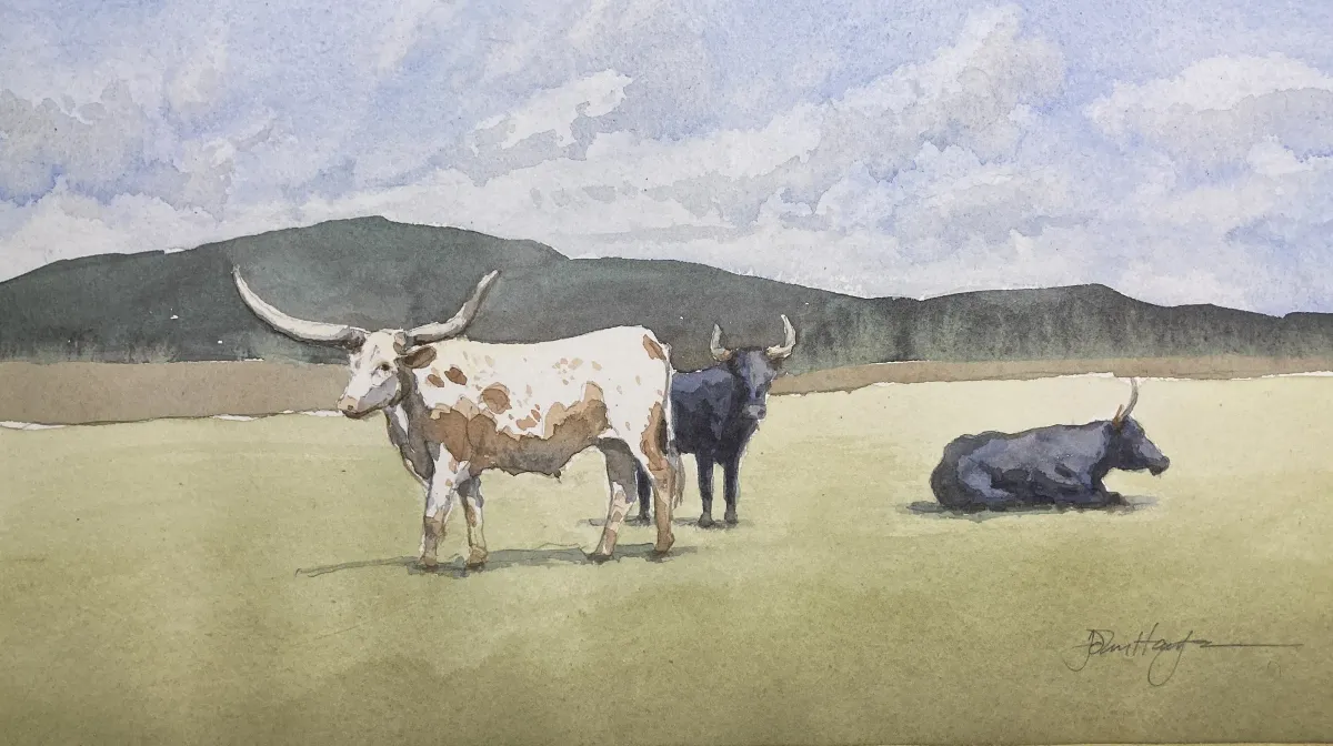 Longhorn cattleWatercolor paintingRural landscapeFarm animalsPastoral sceneMountain backdropCloudy skyRealismImpressionismLight / SereneLandscape / NatureAnimals / Wildlife