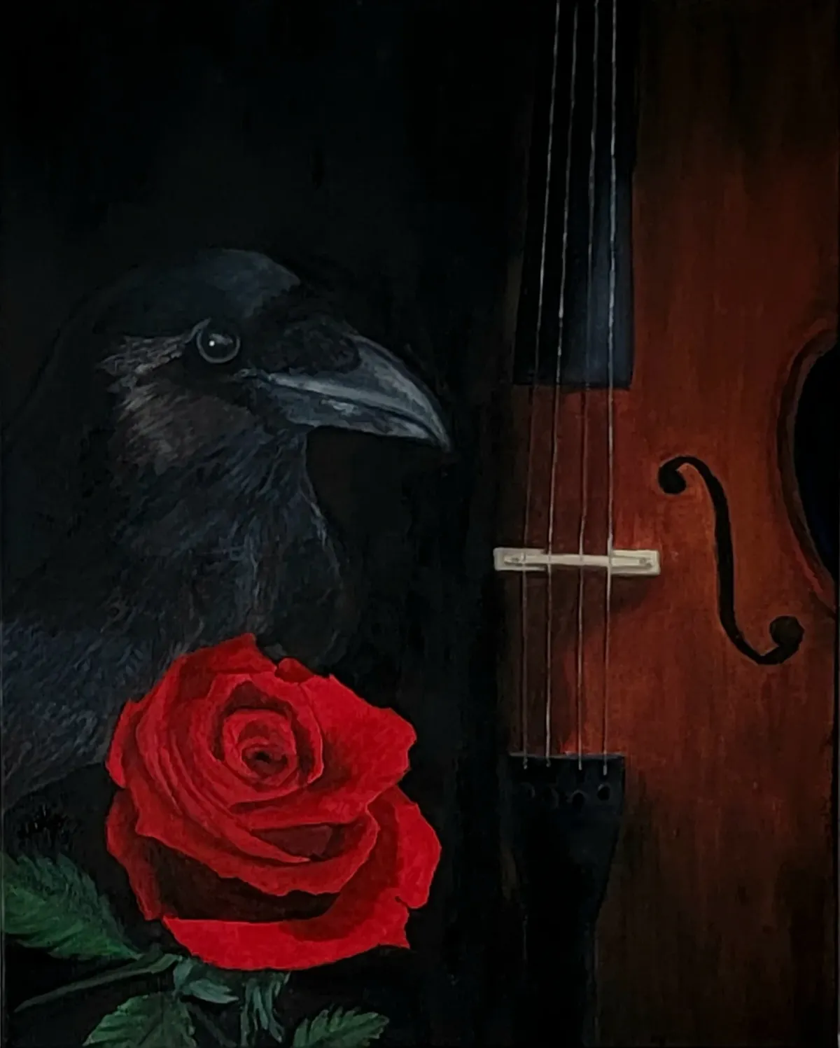 crowravenred rosestring instrumentcellodark artsymbolicRealismDark / DramaticStorytelling / NarrativeAnimals / WildlifeSpiritual / SymbolicStill Life / Objects