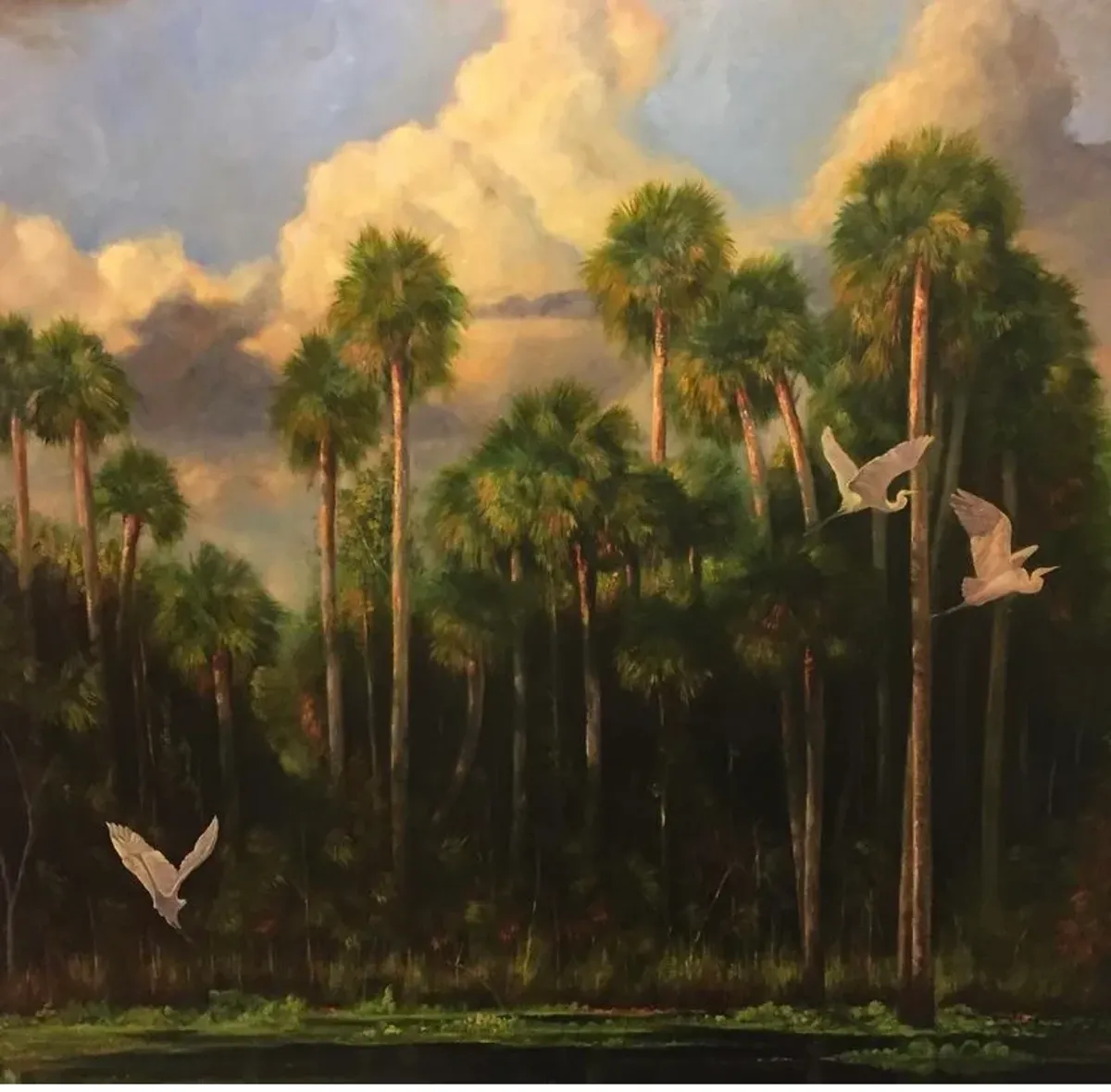 Palm treeswetlandegretslandscape paintingcloudy skytropicalnatureRealismDark / DramaticInspirational / UpliftingLandscape / NatureAnimals / WildlifeSeascape / Water