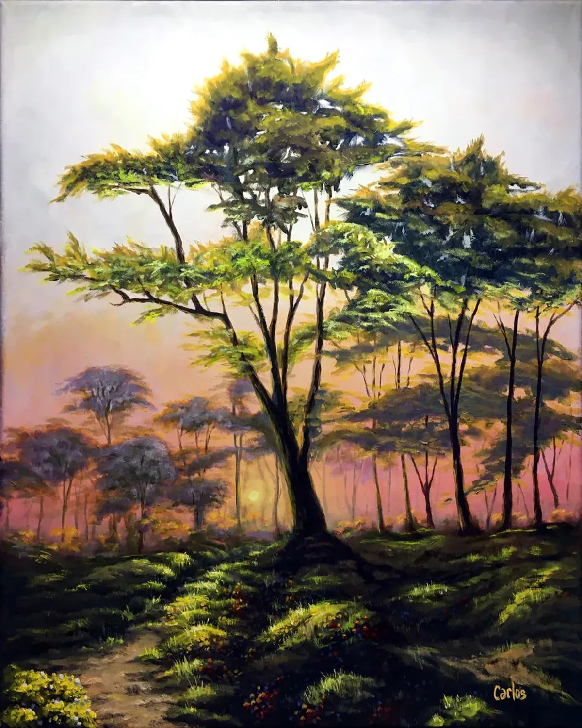 forestlandscapesunsetsunrisetreesnaturepathverdantglowingRealismExpressionism / EmotionalLight / SereneLandscape / Nature
