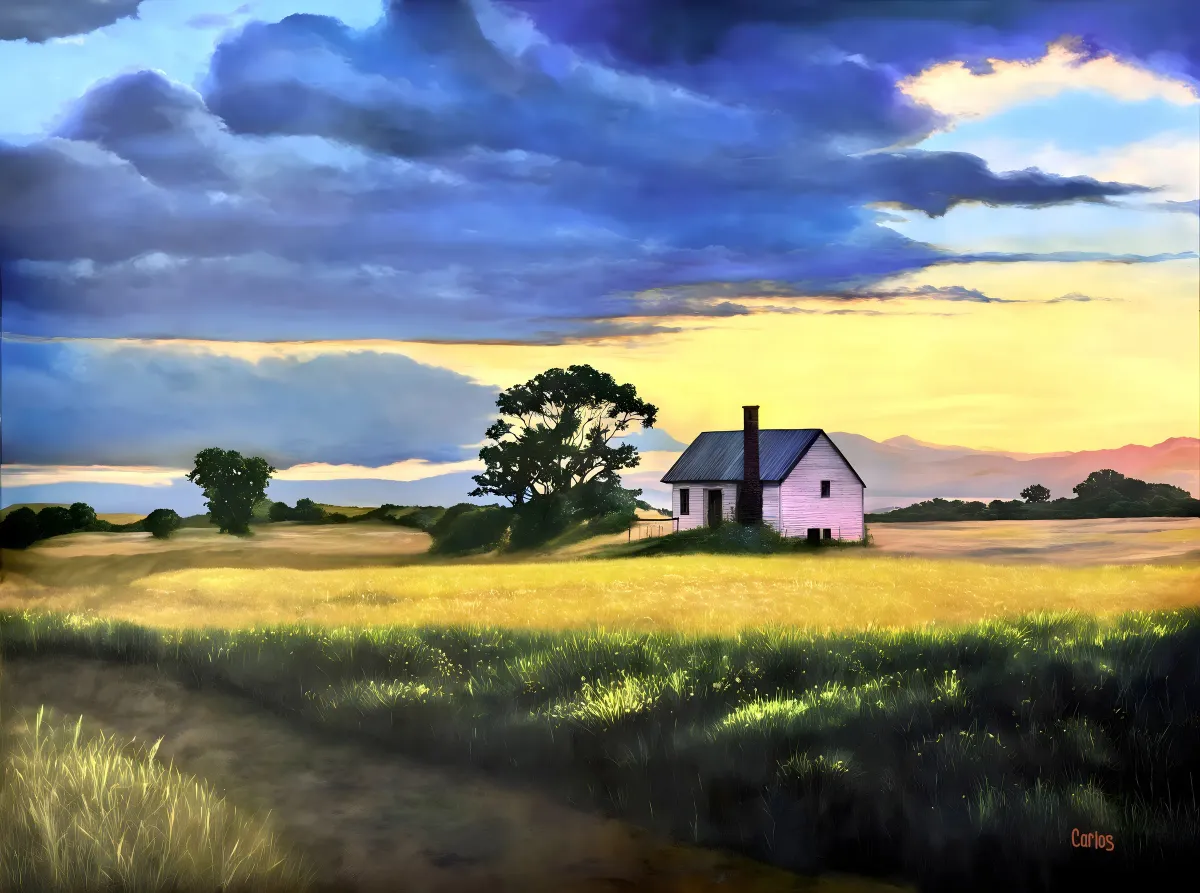 landscapefarmhousegolden fielddramatic skysunsetruralcloudsnaturesereneExpressionism / EmotionalLight / SereneStorytelling / NarrativeLandscape / Nature