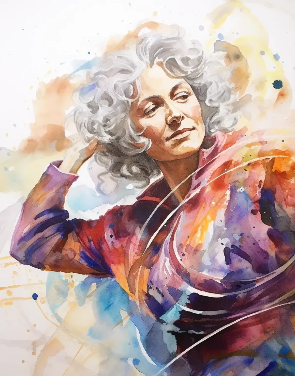 watercolorportraitwomancurly hairvibrantexpressivesplattersExpressionism / EmotionalContemporary / ModernBold / GraphicLight / SerenePortrait / People