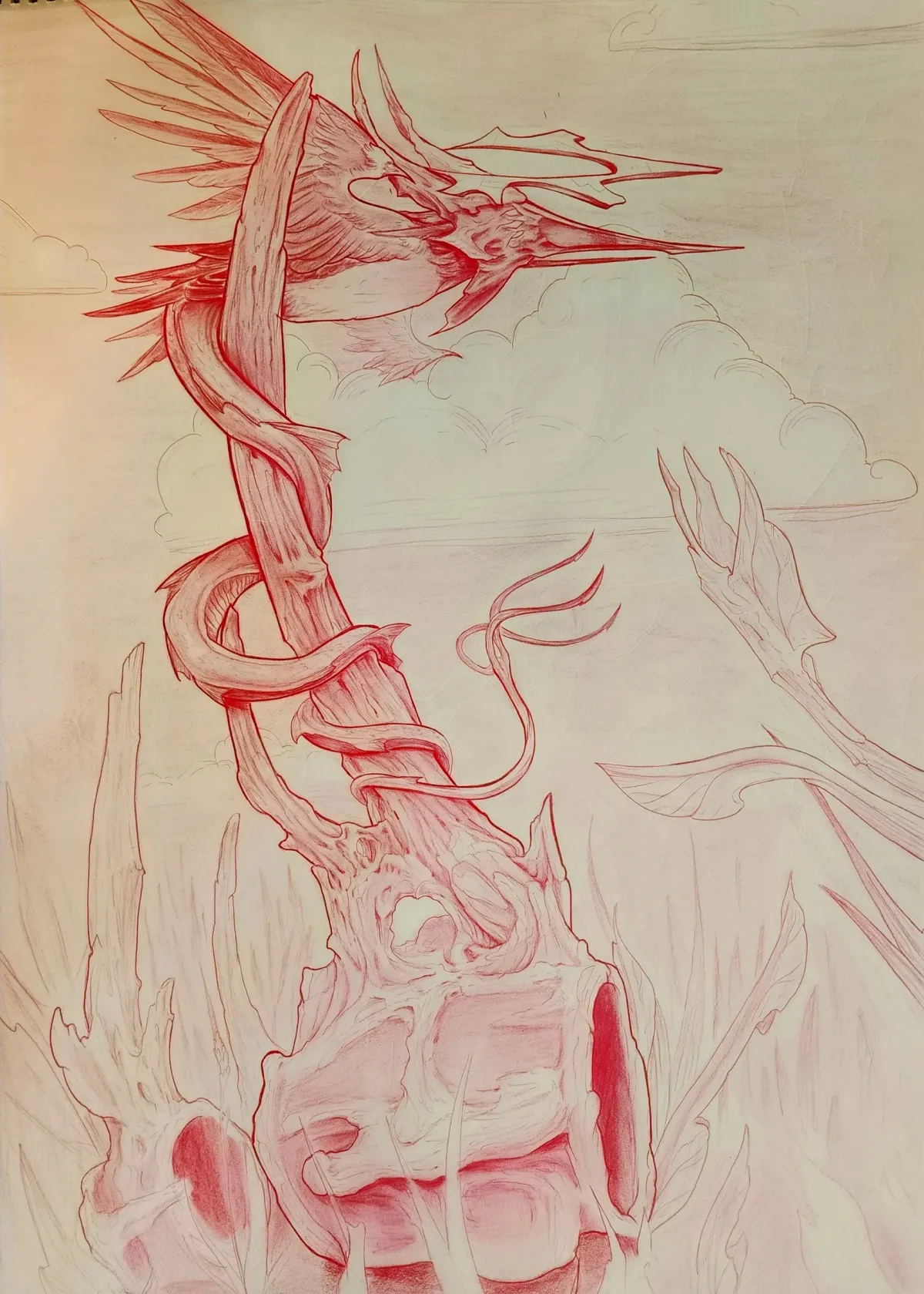 mythical creaturefantasy artred pencil drawingbirdtreesketchdetailed illustrationRealismContemporary / ModernStorytelling / NarrativeBold / GraphicAnimals / WildlifeSurreal / ImaginativeSpiritual / Symbolic