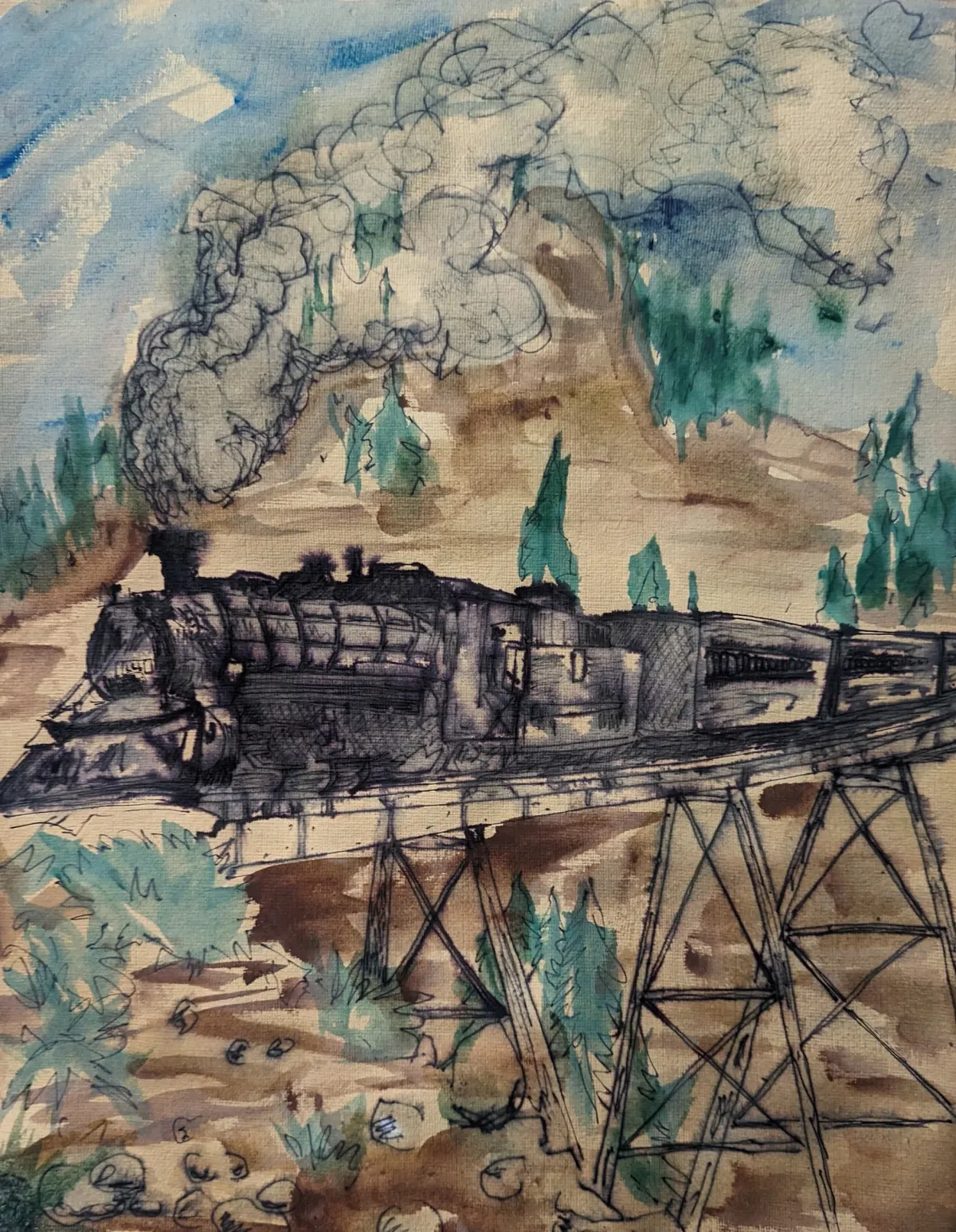 steam trainlocomotiverailway bridgewatercolorink drawinglandscapeexpressiveRealismExpressionism / EmotionalStorytelling / NarrativeDark / DramaticLandscape / NatureHistorical / Cultural