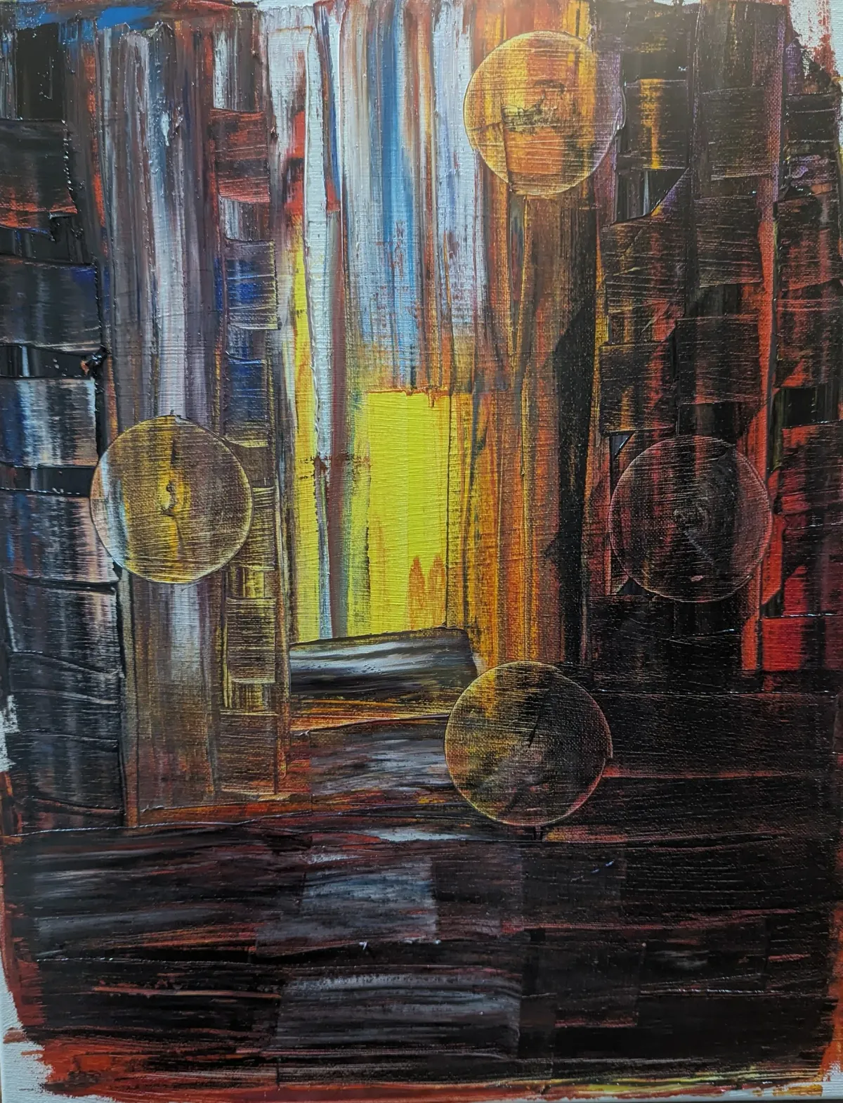 abstracttexturedbrushstrokescircular shapesvibrant colorsdark contrastmodern artAbstractContemporary / ModernBold / GraphicDark / DramaticExpressionism / EmotionalAbstract / ConceptualCity / Architecture