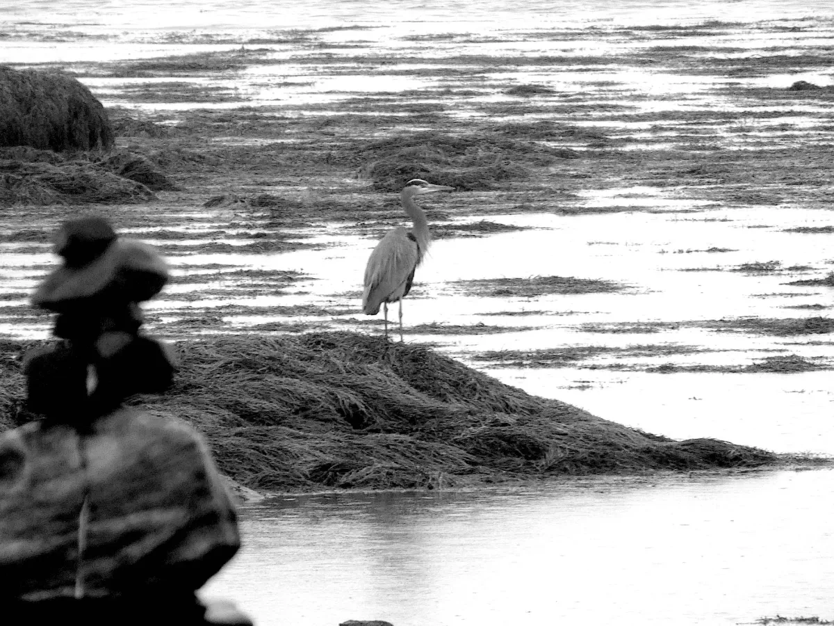 heronbirdtidal poolseaweedblack and whitenaturewildlifeRealismDark / DramaticLandscape / NatureSeascape / WaterAnimals / Wildlife