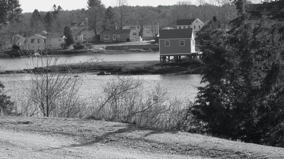 black and whiteriverwaterfronthouse on stiltsbare treeswinter landscaperural sceneRealismLight / SereneLandscape / NatureSeascape / WaterCity / Architecture