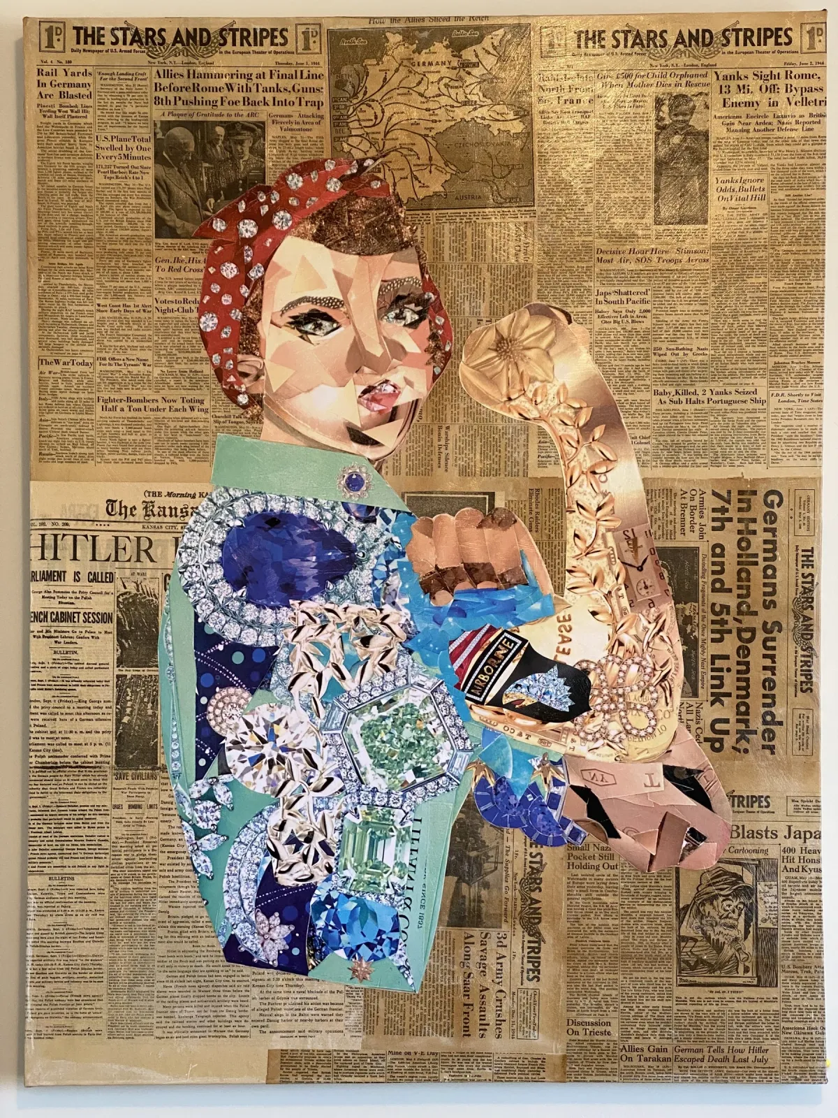 collageRosie the RiveternewspaperWorld War IIpatrioticfeminist artmixed mediaContemporary / ModernBold / GraphicStorytelling / NarrativeInspirational / UpliftingPatriotic / Military / FreedomHistorical / CulturalConflict / SacrificeHope / Healing / Resilience