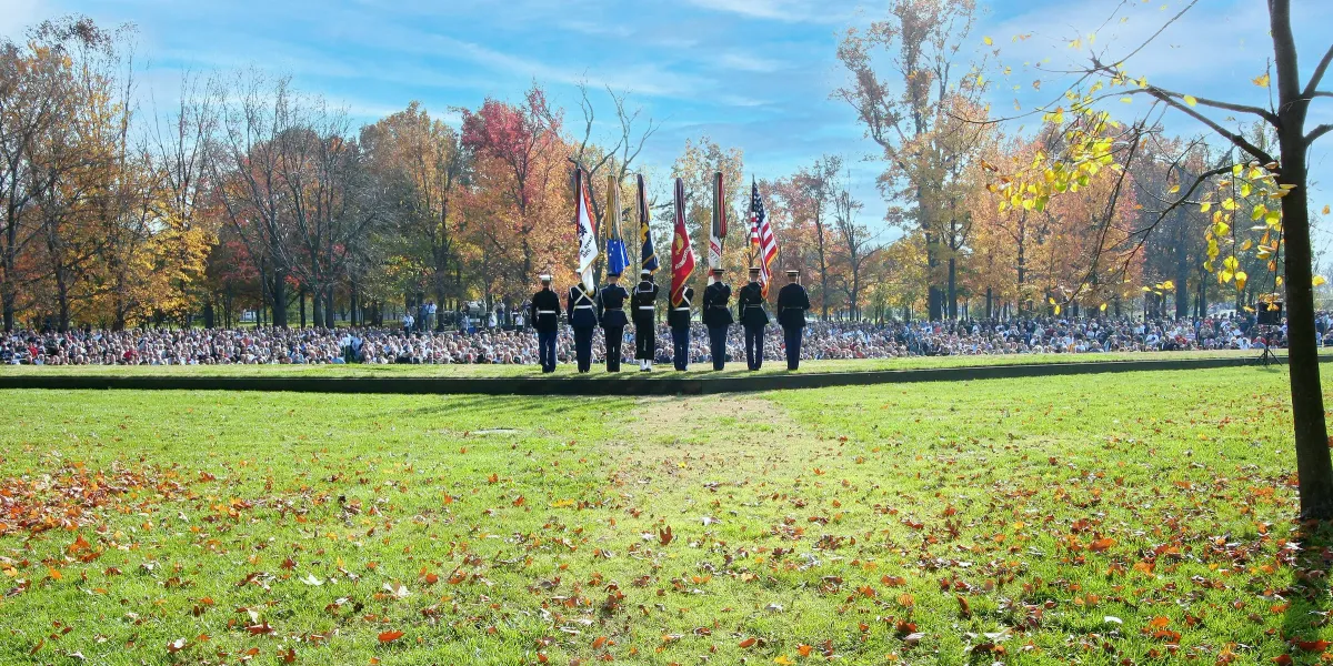 Military ceremonyAutumnVeterans DayColor guardAmerican flagPublic gatheringFall foliageRealismStorytelling / NarrativeInspirational / UpliftingPatriotic / Military / FreedomVeteran Story / ServiceLandscape / NatureHistorical / CulturalConflict / Sacrifice