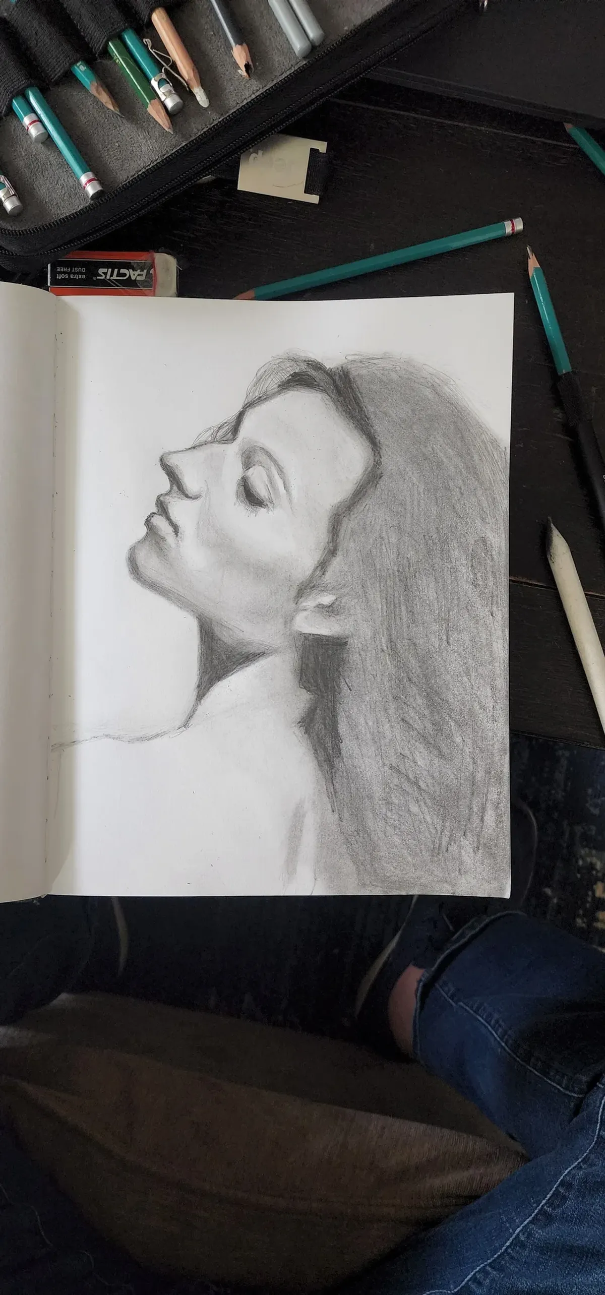 graphite drawingportraitsketchbookart suppliesprofilemonochromaticartistic processRealismContemporary / ModernDark / DramaticPortrait / PeopleStill Life / Objects
