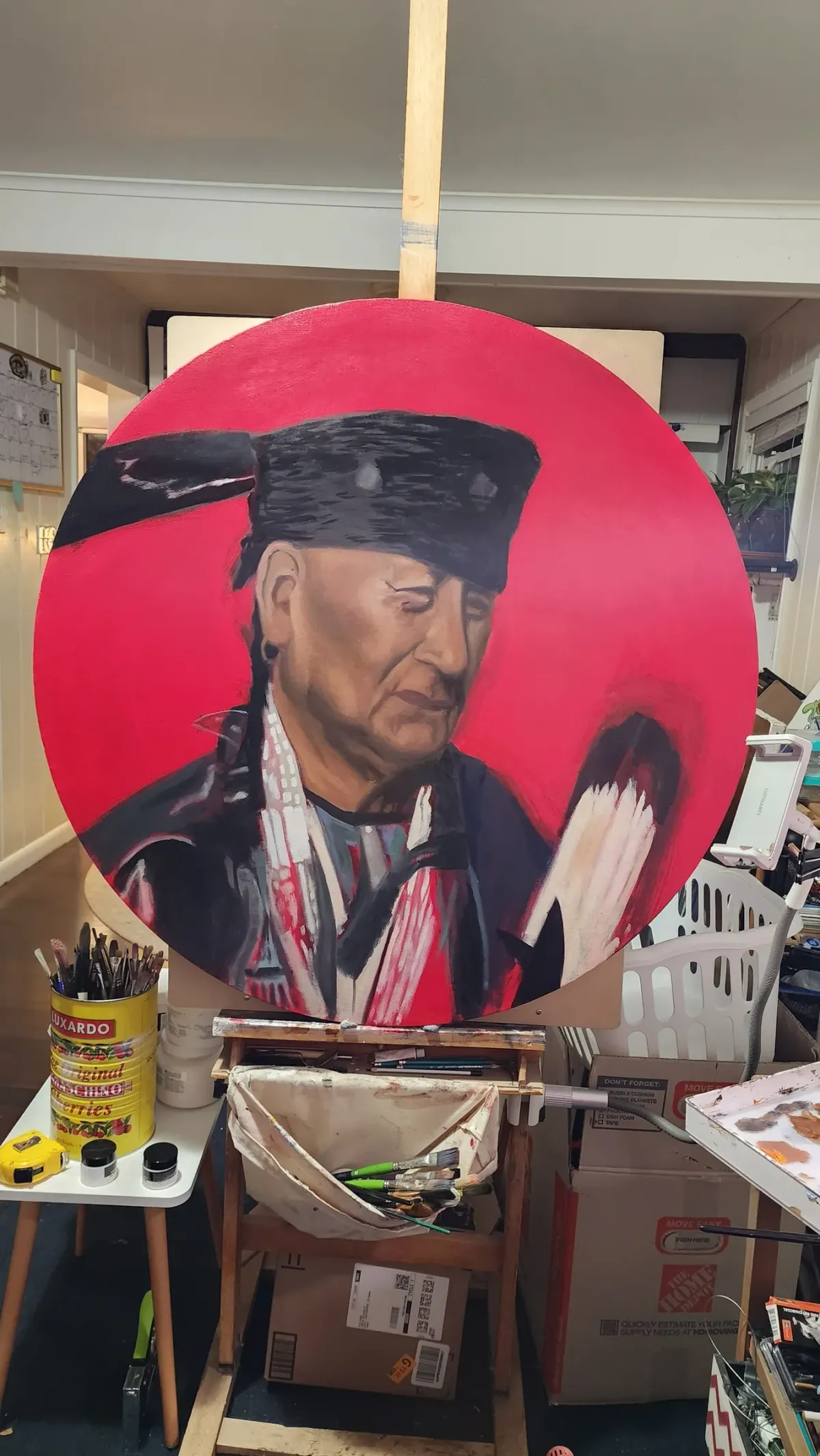 Indigenous manportraitpaintingcircular canvasred backgroundtraditional attireart studioeaselRealismContemporary / ModernStorytelling / NarrativePortrait / PeopleHistorical / CulturalSpiritual / Symbolic