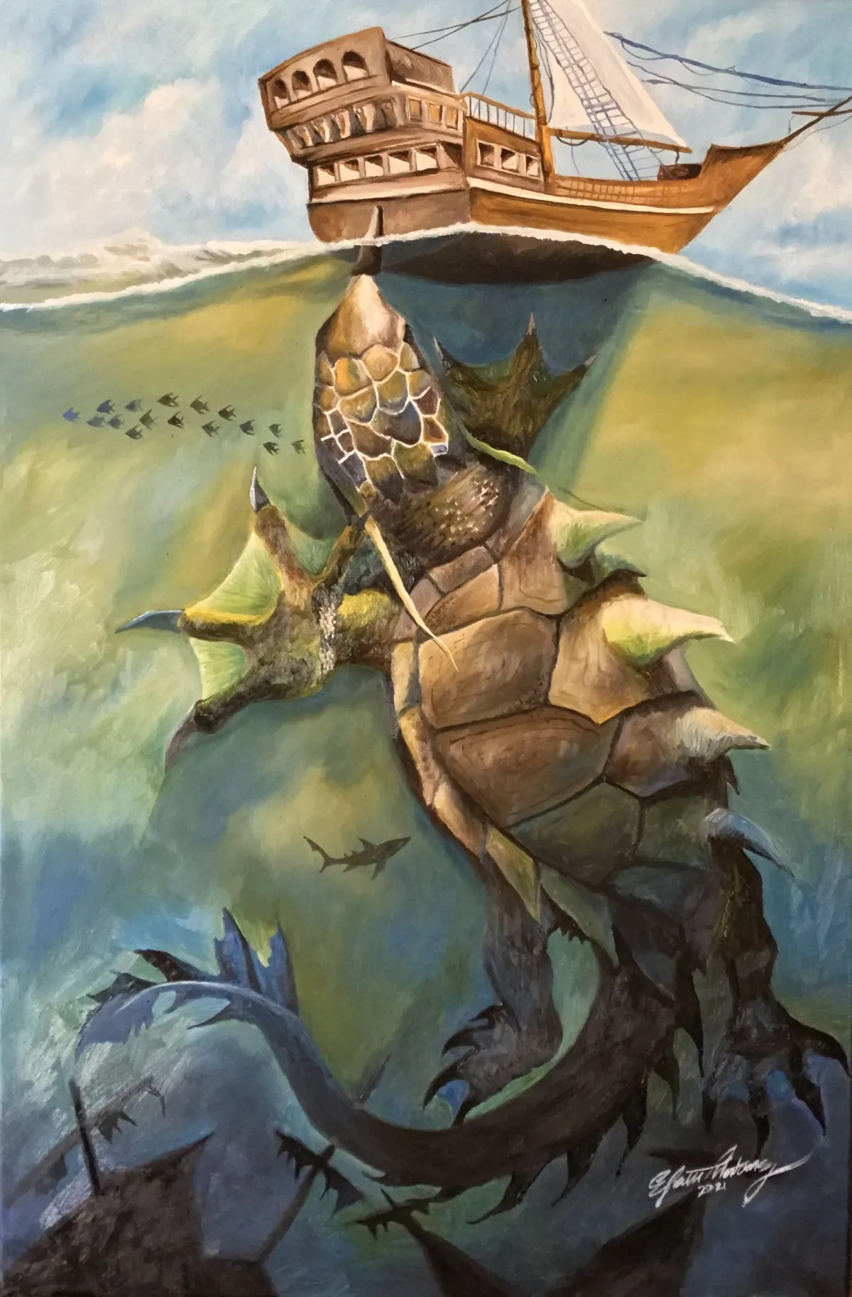 sea monstermythical creaturesailing shipocean artfantasyunderwater scenedragon turtleRealismStorytelling / NarrativeDark / DramaticSeascape / WaterAnimals / WildlifeSurreal / ImaginativeConflict / Sacrifice