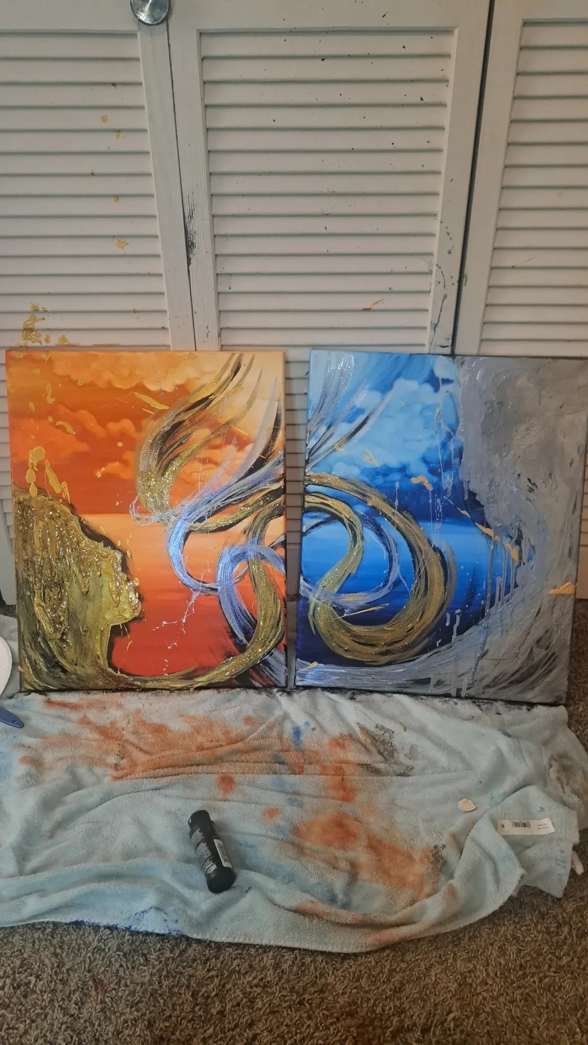 abstract artdiptychgold paintblueorangeswirlscontemporary paintingAbstractContemporary / ModernBold / GraphicAbstract / ConceptualSpiritual / Symbolic