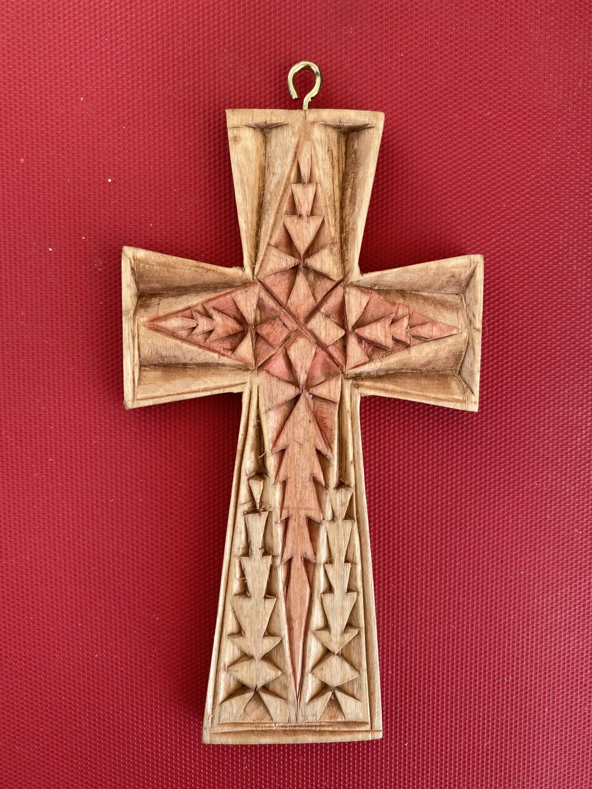 wooden crosswood carvinggeometric patternreligious artspiritual symbolcraftsmanshipred backgroundRealismStorytelling / NarrativeInspirational / UpliftingSpiritual / SymbolicStill Life / ObjectsHistorical / Cultural