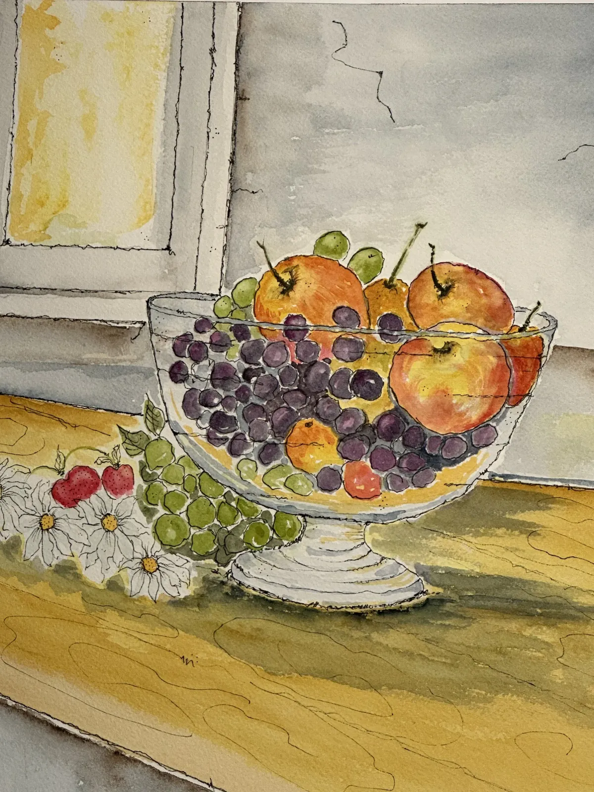 WatercolorStill lifeFruit bowlGrapesApplesInk drawingFlowersRealismContemporary / ModernBold / GraphicLight / SereneLandscape / NatureStill Life / Objects