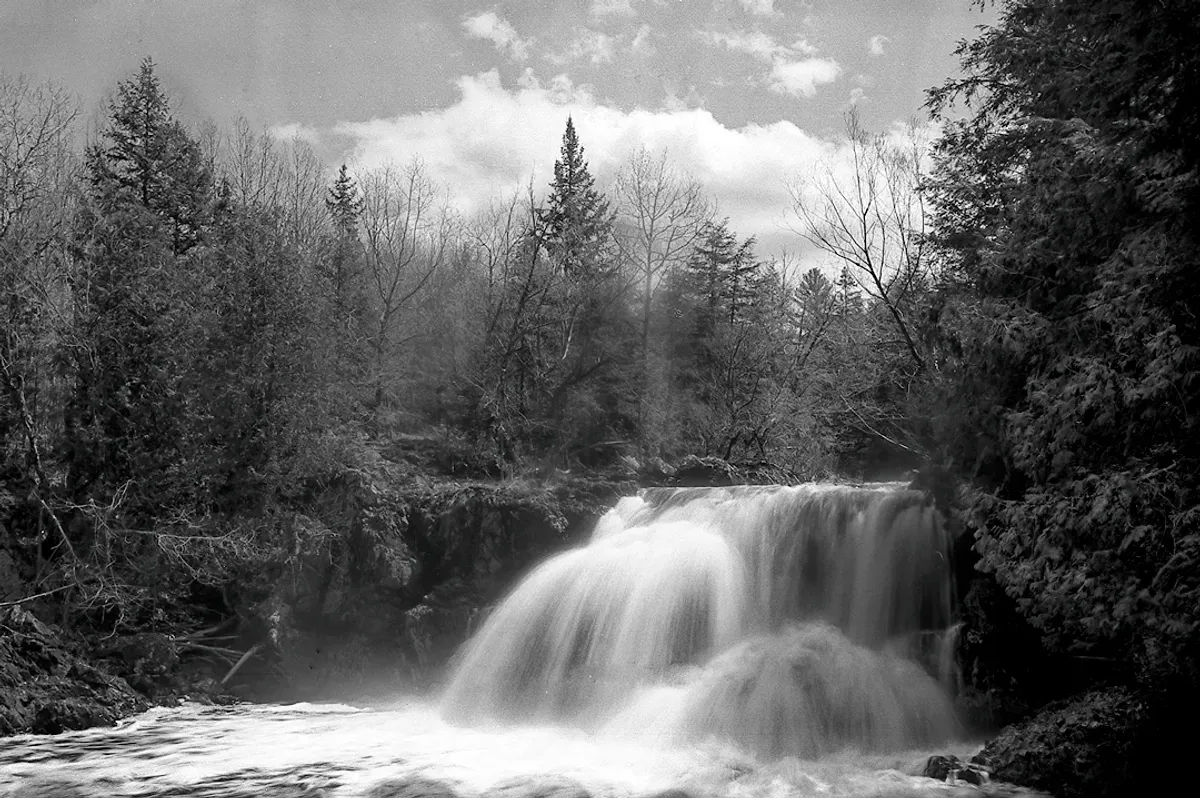 waterfallblack and whitenatureforestriverlandscapetreesRealismDark / DramaticLight / SereneLandscape / NatureSeascape / Water