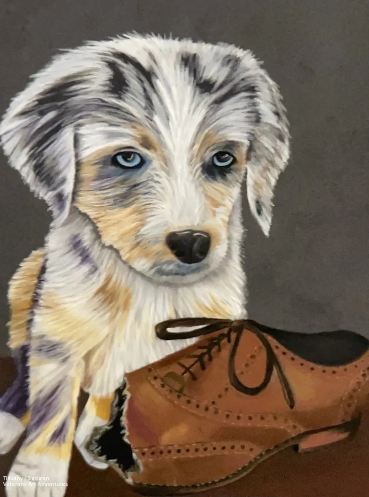 PuppyDogMischiefChewed shoeAnimal portraitBlue eyesPet artRealismStorytelling / NarrativeContemporary / ModernAnimals / WildlifeHumor / Whimsy