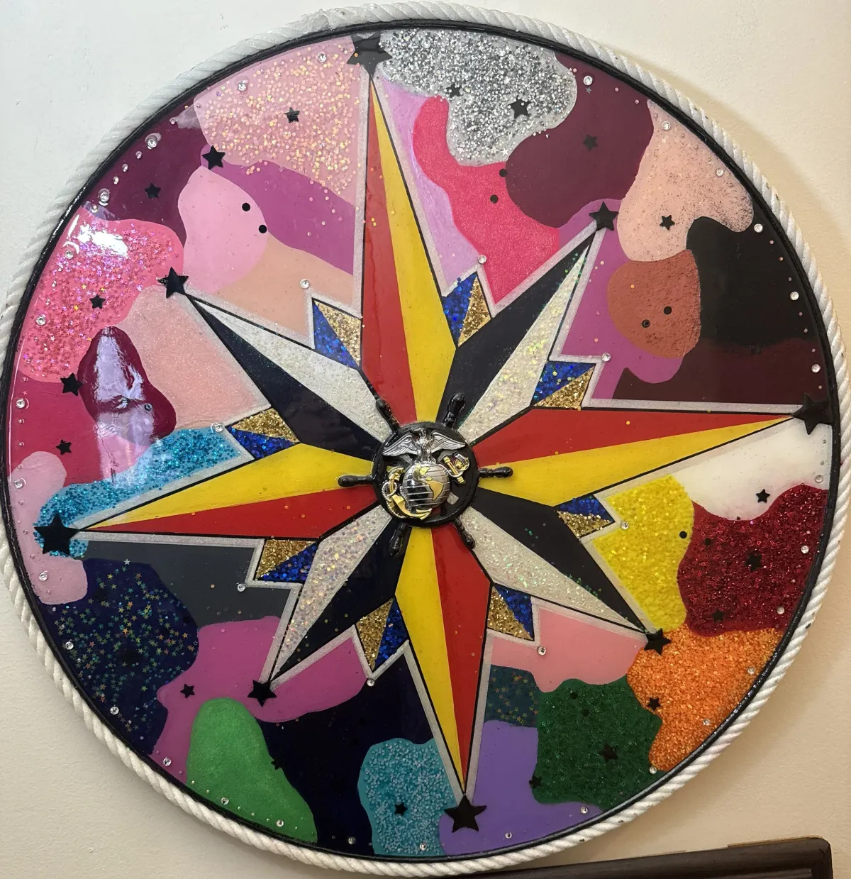 Compass RoseGlitter ArtMixed MediaMarine Corps EmblemVibrant ColorsAbstract BackgroundStarsBold / GraphicContemporary / ModernInspirational / UpliftingPatriotic / Military / FreedomAbstract / ConceptualSpiritual / Symbolic