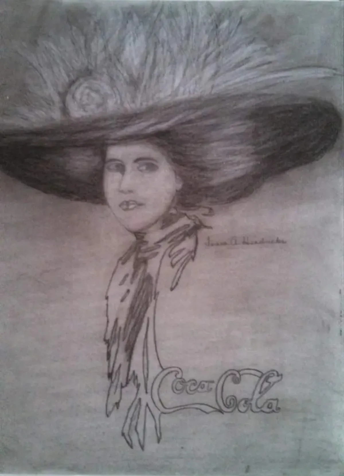 Pencil sketchWomanFeathered hatGrayscalePortraitCoca-ColaVintage styleRealismStorytelling / NarrativeDark / DramaticBold / GraphicPortrait / PeopleHistorical / Cultural