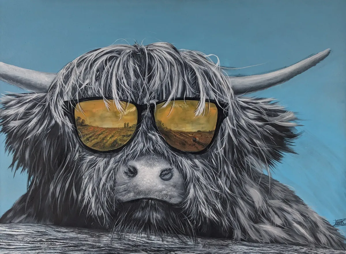 Highland cowsunglassesanimal portraitlandscape reflectionhumorousfurrycontemporary artRealismContemporary / ModernBold / GraphicStorytelling / NarrativeLandscape / NatureAnimals / WildlifeHumor / Whimsy