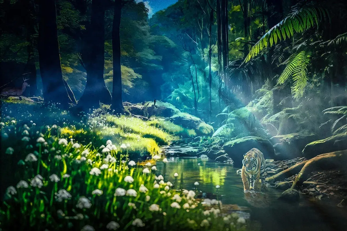 jungletigerwildlifenaturestreamenchanted forestsunlightRealismLight / SereneStorytelling / NarrativeInspirational / UpliftingLandscape / NatureAnimals / WildlifeSpiritual / SymbolicSurreal / Imaginative