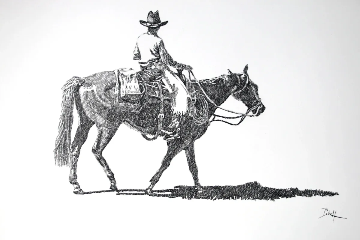 cowboyhorseequestriancross-hatchingink drawingwesternmonochromeRealismBold / GraphicStorytelling / NarrativePortrait / PeopleAnimals / WildlifeHistorical / Cultural