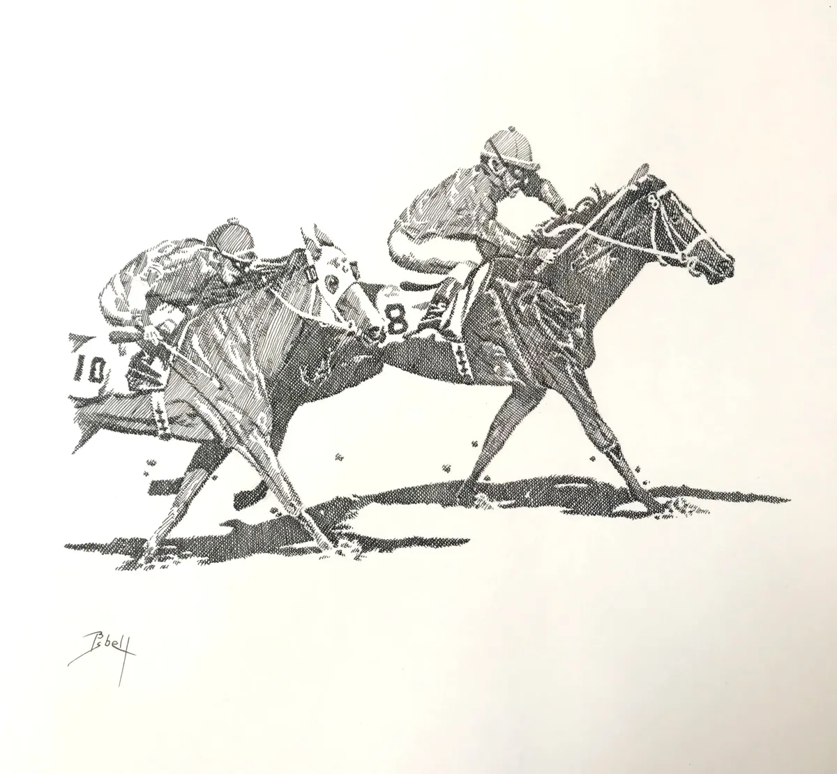 Horse RacingJockeysPen and InkDrawingEquine ArtCompetitionAthleticsRealismStorytelling / NarrativeBold / GraphicAnimals / WildlifeHistorical / Cultural