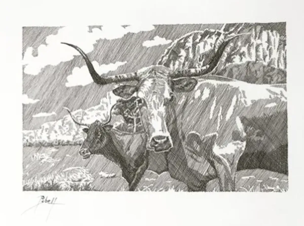 longhorncattledrawingpen and inkmonochromelandscapelivestockRealismBold / GraphicStorytelling / NarrativeAnimals / WildlifeLandscape / Nature