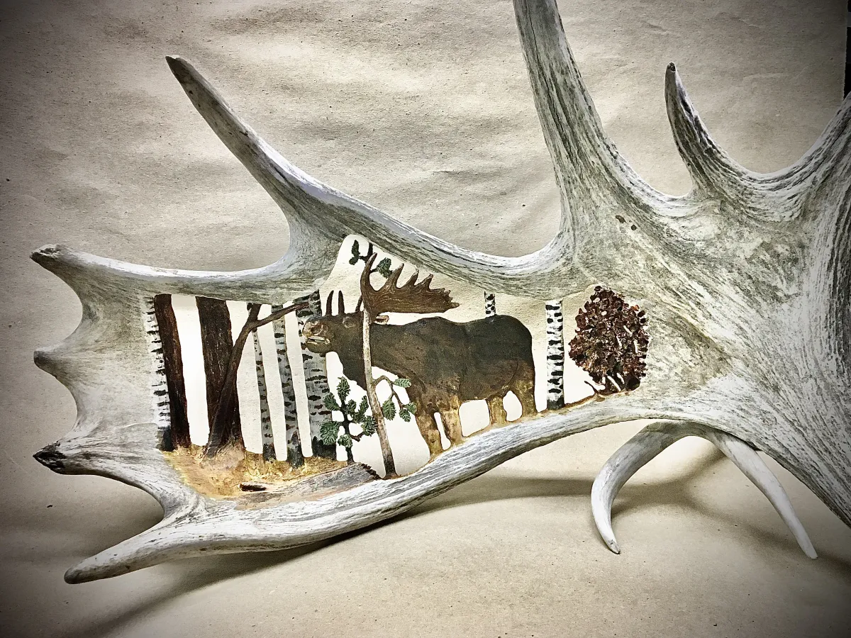 Moose antler artWildlife paintingNature sceneBirch treesAnimal artRustic decorHandicraftRealismStorytelling / NarrativeLight / SereneLandscape / NatureAnimals / Wildlife