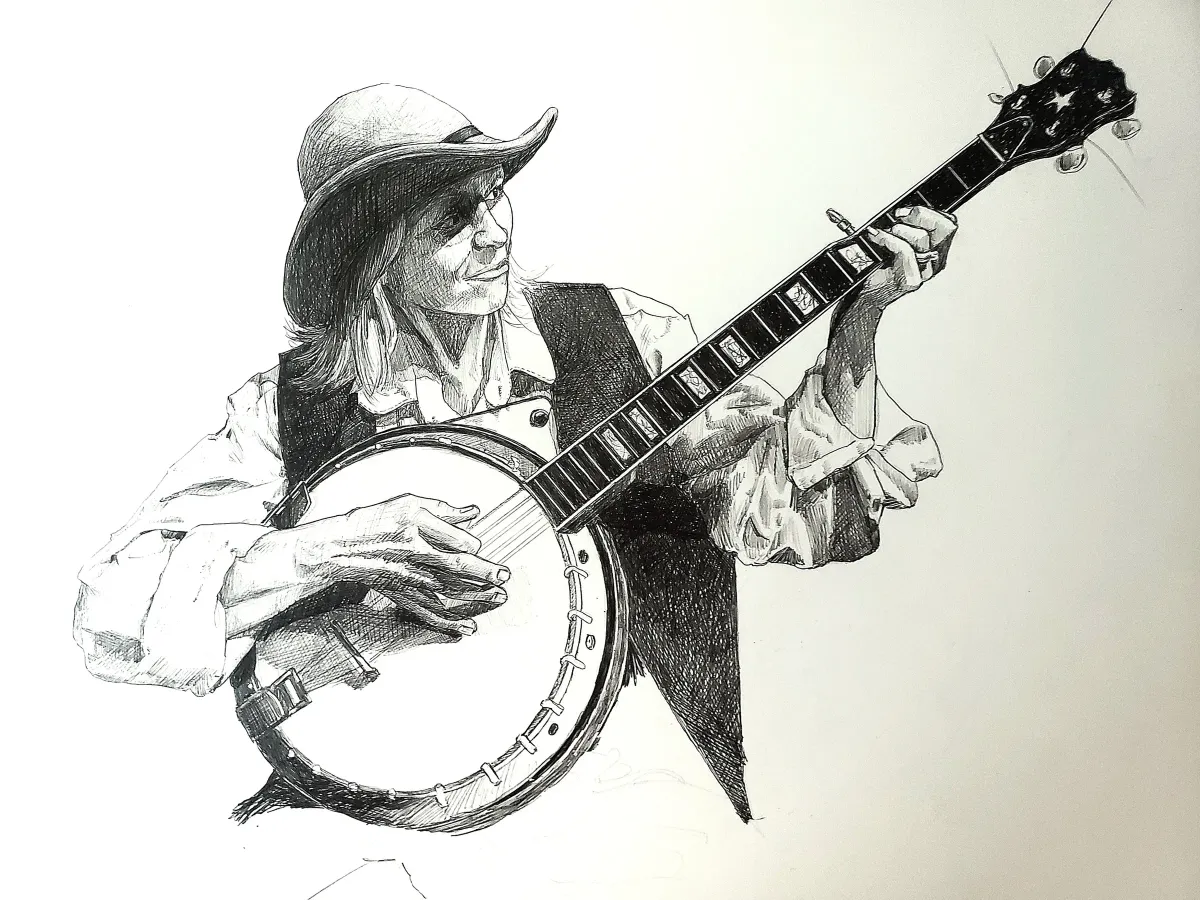 banjo playercowboy hatink drawingmusical instrumentportraitcross-hatchingmonochromeRealismStorytelling / NarrativeBold / GraphicPortrait / PeopleHistorical / Cultural