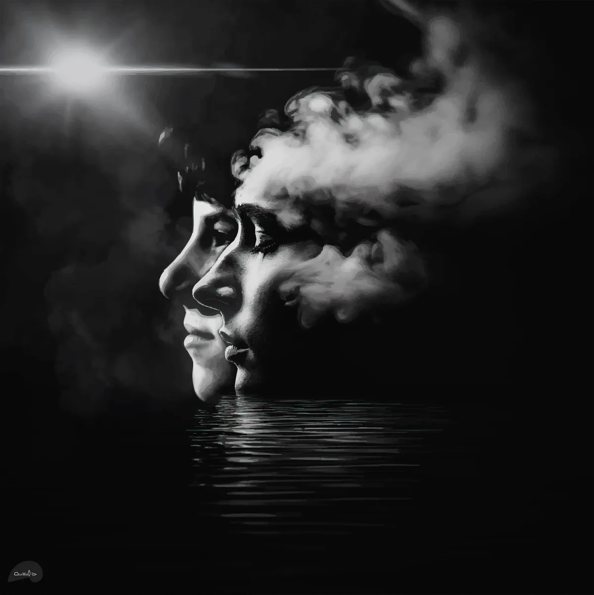 black and whitesurrealismportraitsmokewater reflectionintrospectiondramatic lightingRealismContemporary / ModernDark / DramaticStorytelling / NarrativeTherapeutic / ReflectivePortrait / PeopleSpiritual / SymbolicSurreal / Imaginative