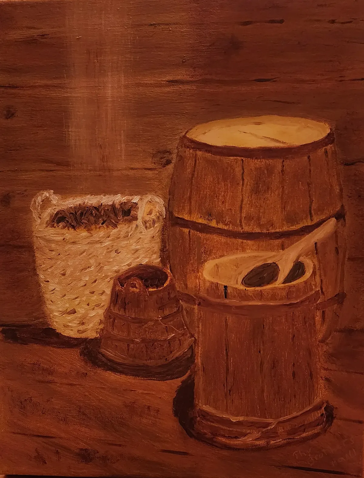 Still liferusticwooden objectsbarrelbasketscooptraditionalearthyRealismStorytelling / NarrativeDark / DramaticStill Life / ObjectsHistorical / Cultural