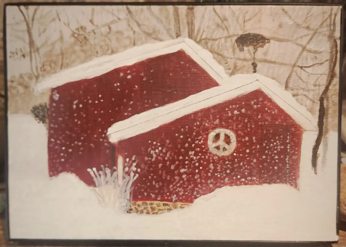 Winter scenesnowred shedspeace signlandscape paintingfolk artwinter landscapeRealismStorytelling / NarrativeLight / SereneInspirational / UpliftingLandscape / NatureSpiritual / SymbolicHope / Healing / Resilience