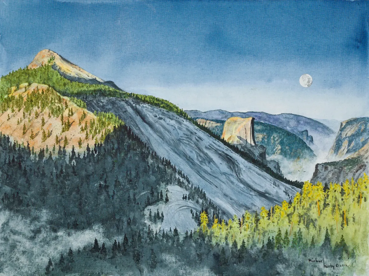 YosemitelandscapewatercolormountainsforestmoonnatureRealismLight / SereneTherapeutic / ReflectiveLandscape / Nature